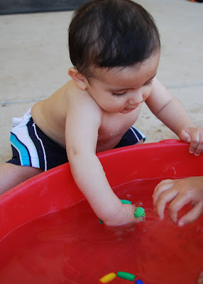We've been having some very strange weather lately. Cold one day, warm the next, etc., etc., so on and so forth. Well today was a HOT day, so hot, that I pulled out the ladybug sandbox and filled it with water for the kids to play in.